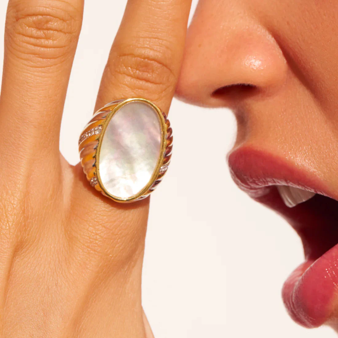 La bague Amara en nacre de Be Maad est une pièce remarquable qui allie élégance et originalité. Sa forme ovale XXL est sublimée par un somptueux mélange de pierres naturelles et de zircons, lui conférant un charme intemporel.