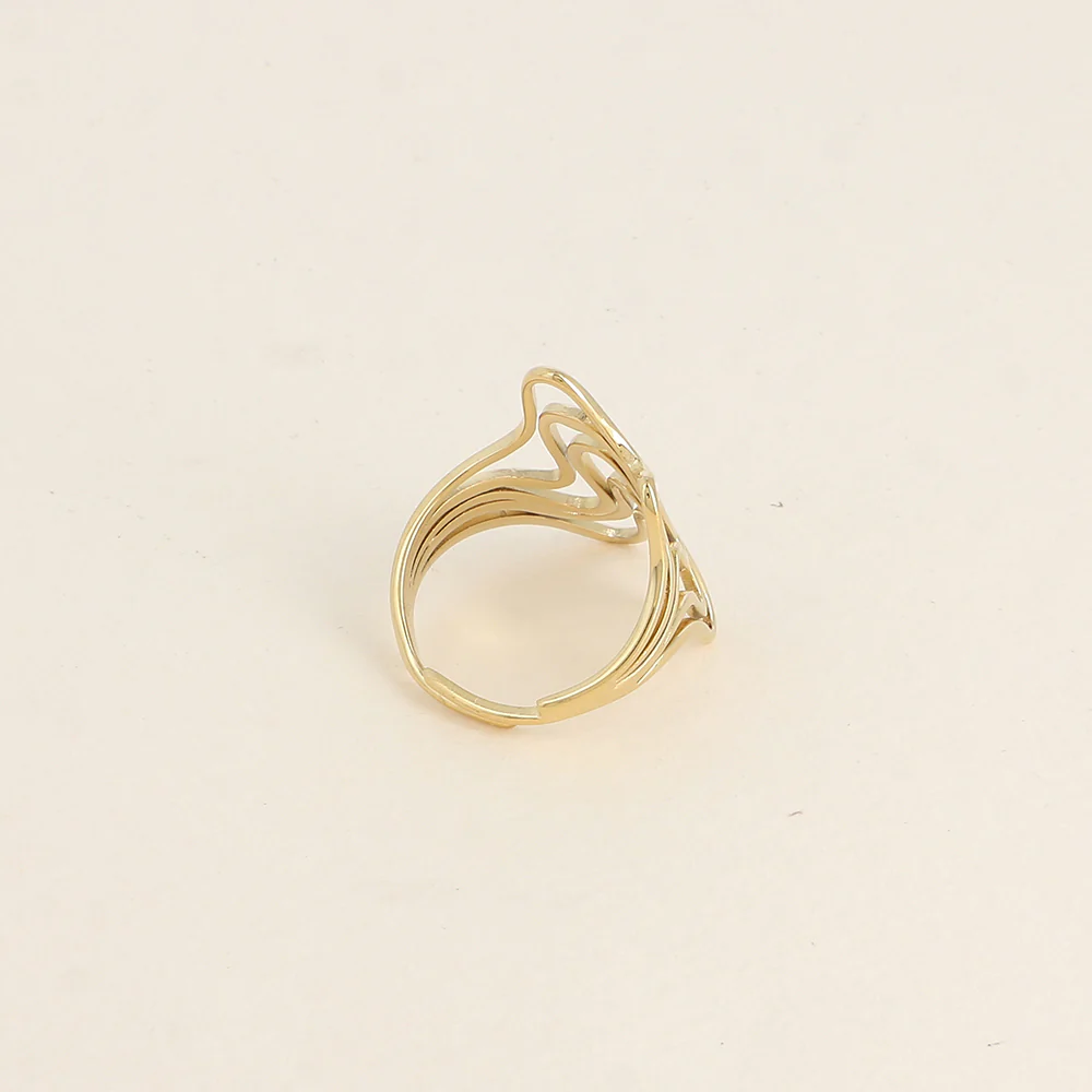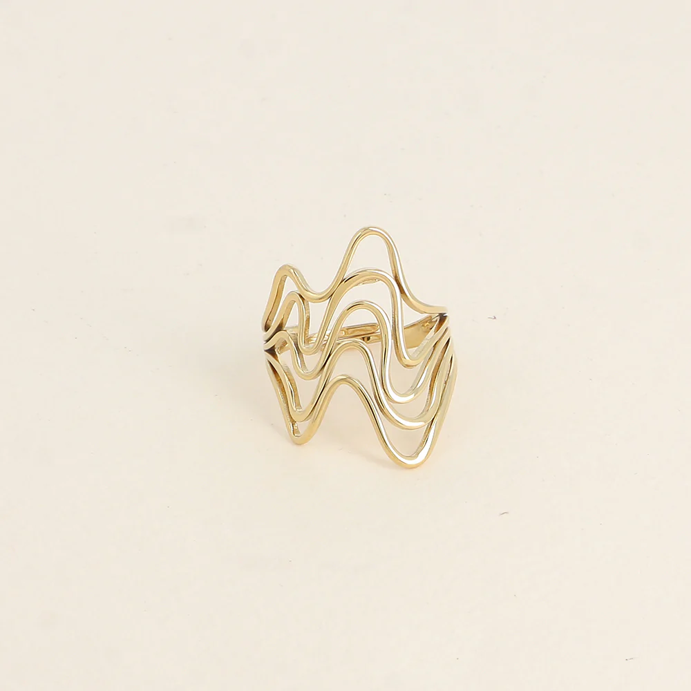 Bague large en acier inoxydable composée de 5 anneaux ondulés.Ajustable, la bague se resserre ou s’agrandit : de la taille 50 à 58Hauteur max de la bague : 26 mmEpaisseur de l’anneau : 2 mm Garantie sans nickel, sans cadmium, sans sel de plomb.Résiste à l’eau et ne noircit pas.