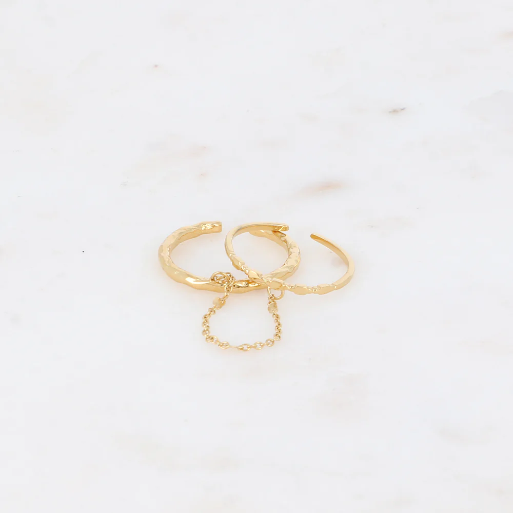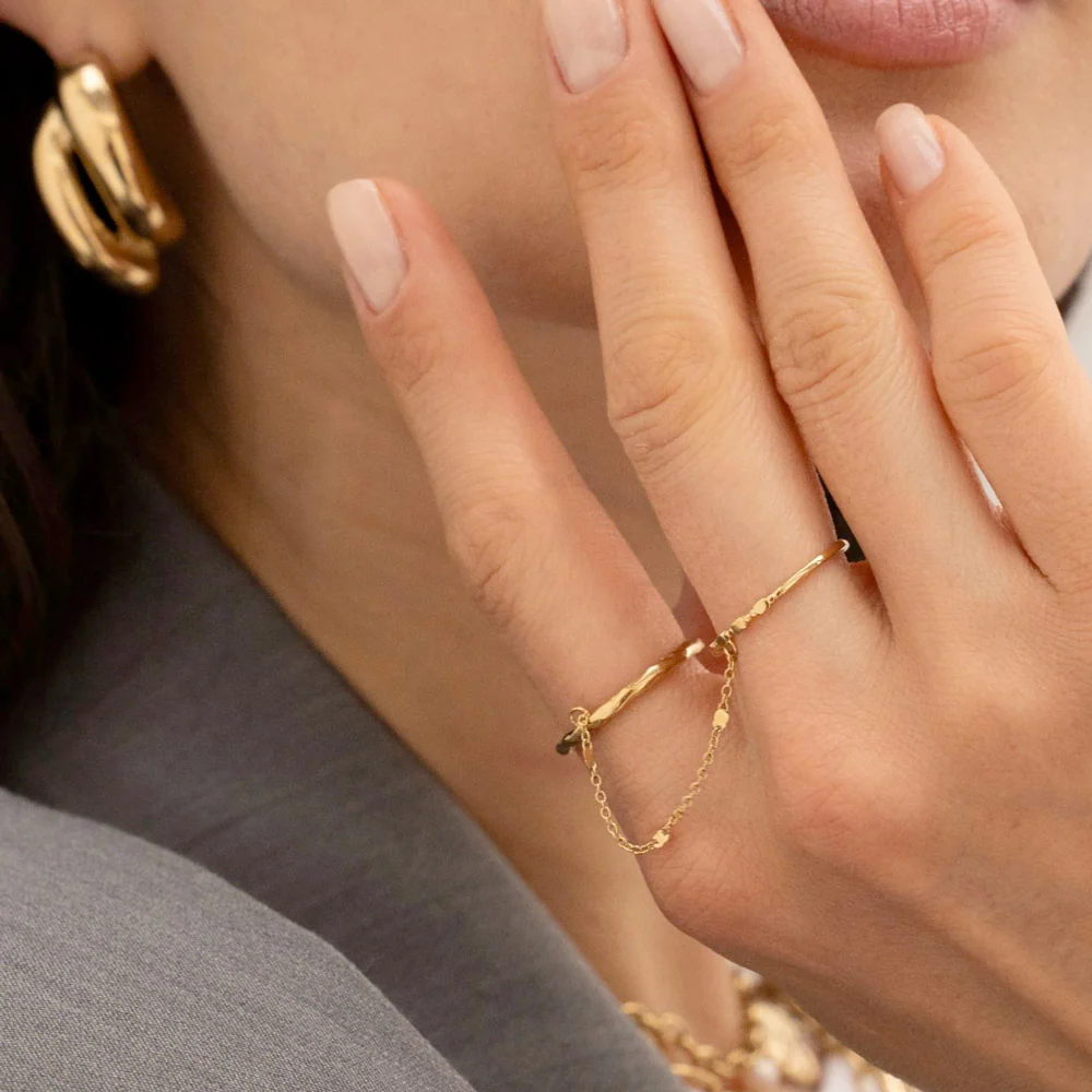Ajustable, la bague se resserre ou s’agrandit : de la taille 50 à 58Epaisseur de l’anneau : 2 mm & 1 mm Longueur de la chaîne : 4 cm Résiste à l’eau et ne noircit pas.