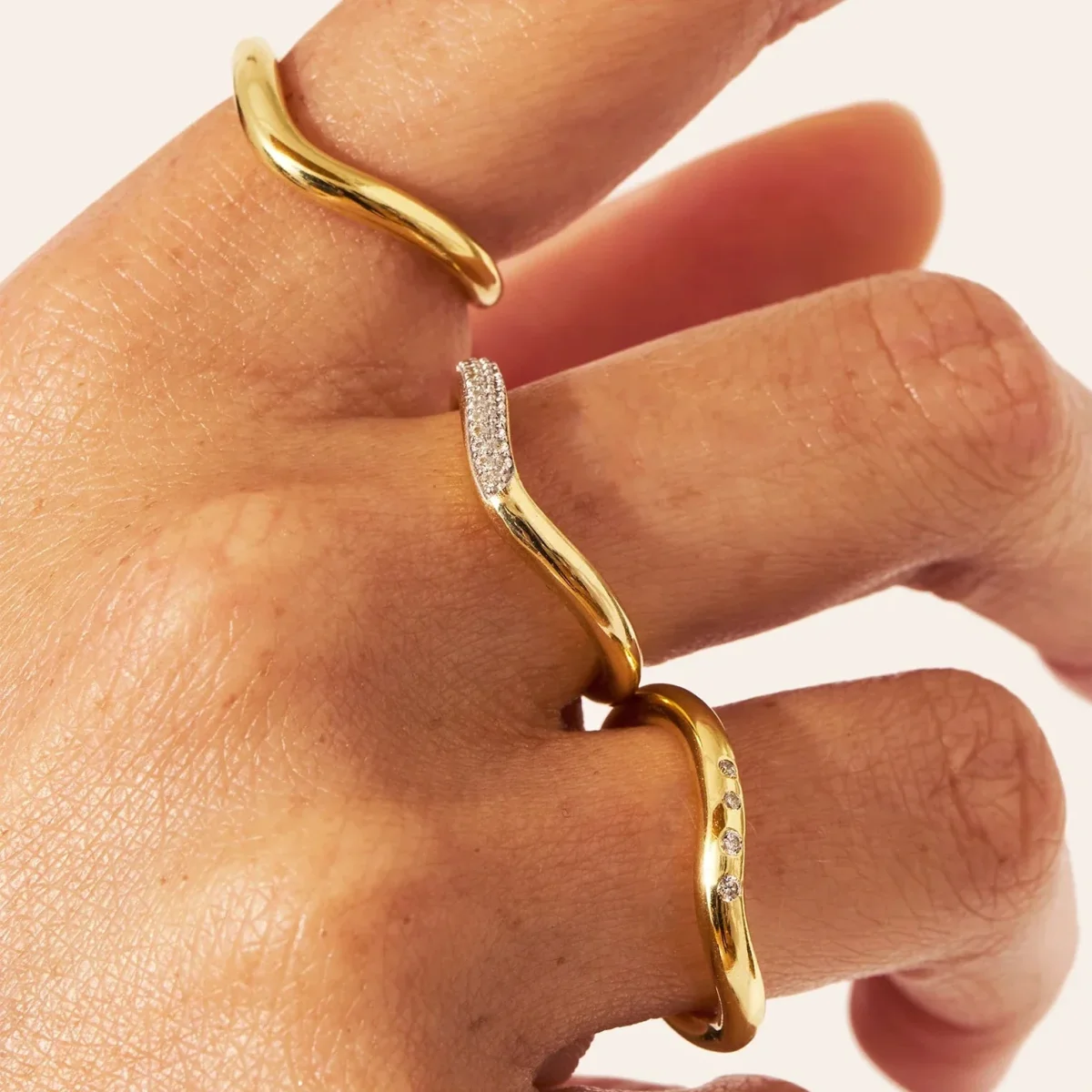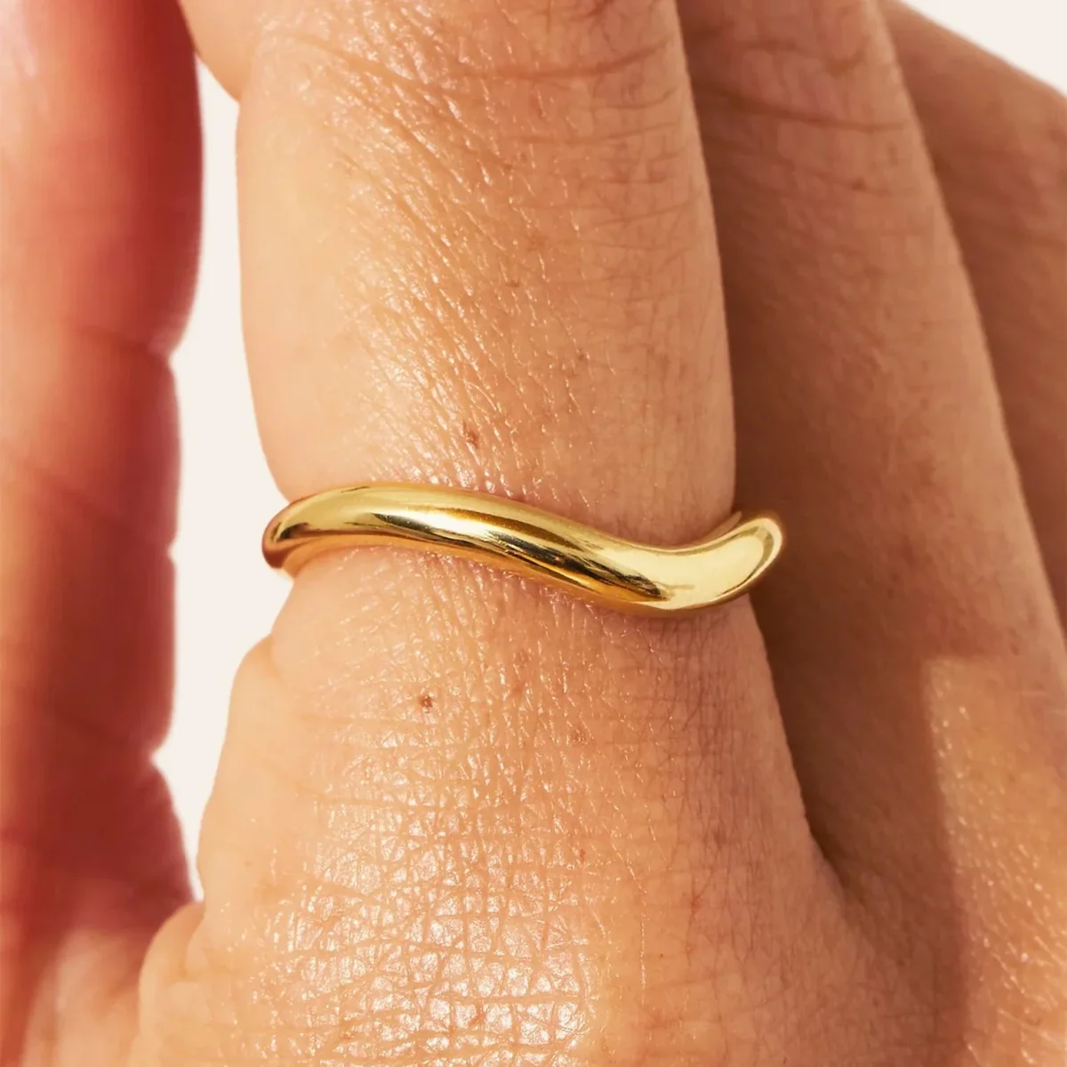 Telle une vague figée dans le métal, cette bague dorée courbée joue la carte de la pureté et de l’originalité. Sans pierre mais jamais sans intensité, elle affirme un style minimaliste et organique grâce à sa forme unique. À porter seule pour souligner une main ou à empiler à d’autres pour amplifier son effet.