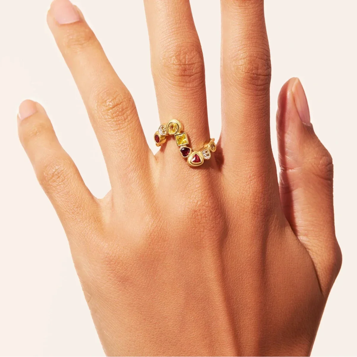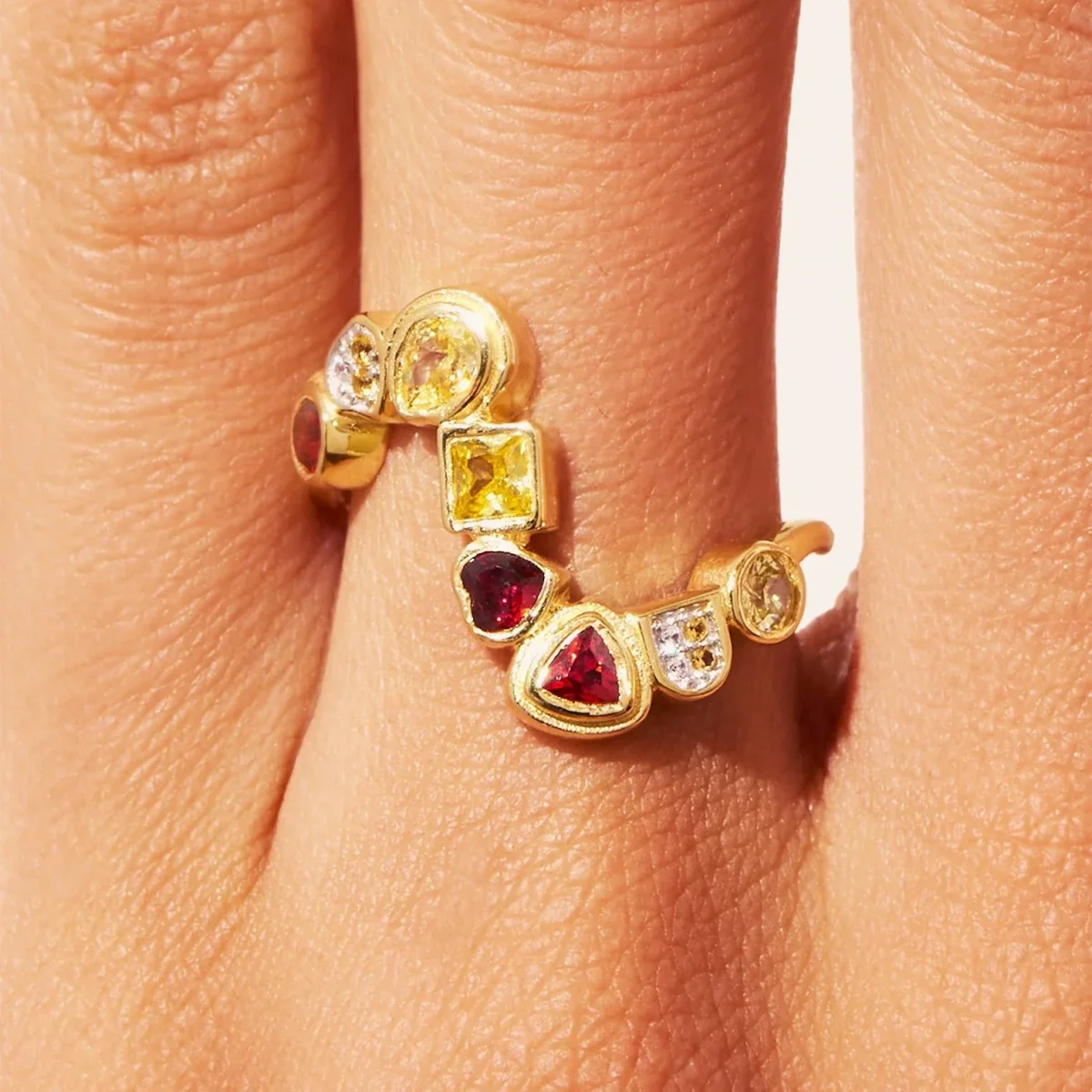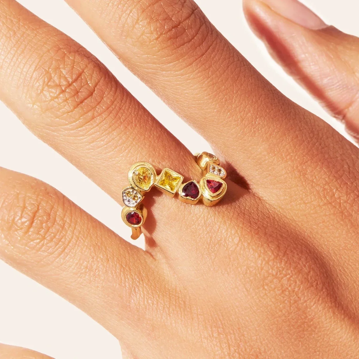 Comme une vague de lumière, la bague zircons jaunes et grenat Rivière porte parfaitement son nom. Sa cascade de huit fines pierres aux formes variées s’élance et enlace votre doigt, comme un mouvement fluide qui ne s’arrête jamais. Chaque détail, pensé et sculpté avec soin, confère à ce bijou un chic assumé.