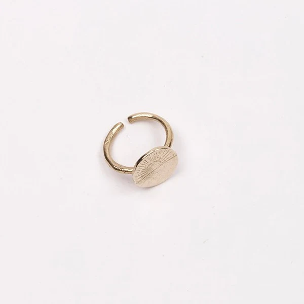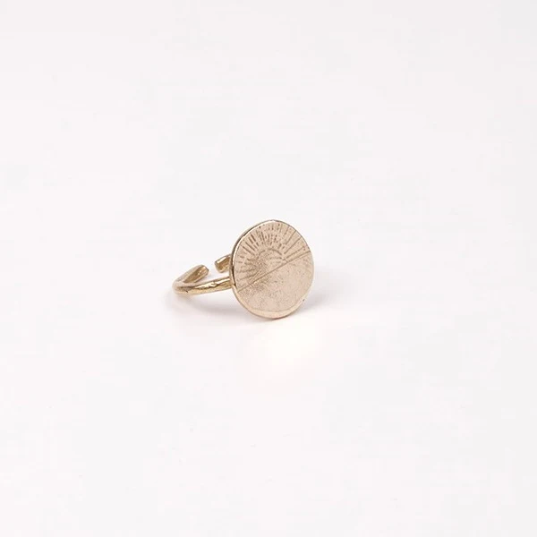 Bague en laiton doré, surmontée par un disque en bronze gravé d’un soleil.