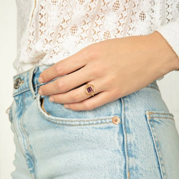 Bague dorée à l’or 24 carats, ornée de cristaux swarovski violets. Pleine de « pep’s », la collection Zazie joue avec des lignes sobres mêlant simplicité et cristaux étincelants aux reflets gris, verts et violets. Des bijoux graphiques et sophistiqués. Taille ajustable, convient aux tailles 50 à 56 Bijou fabriqué à la main à Paris.