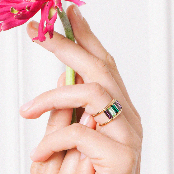 Bague dorée à l’or 24 carats, ornée de cristaux Swarovski multicolores.
