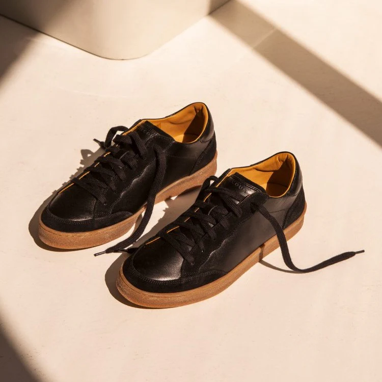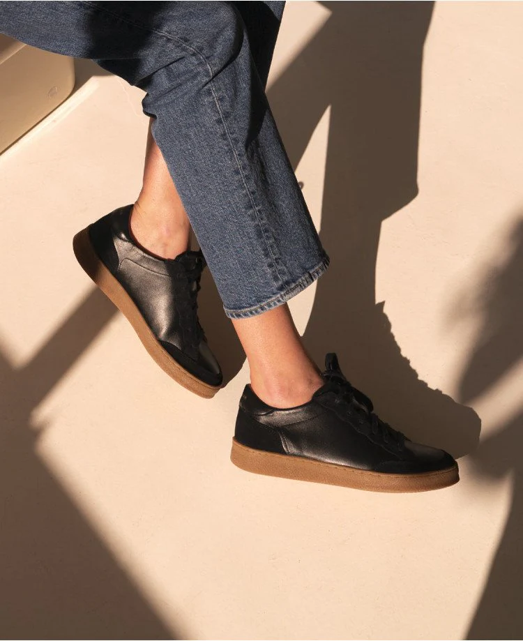 Baskets noires, un best seller de la boutique, d’un confort absolu et idéales pour tous types de styles et tenues. Ici présentées en cuir noir et semelle marron.