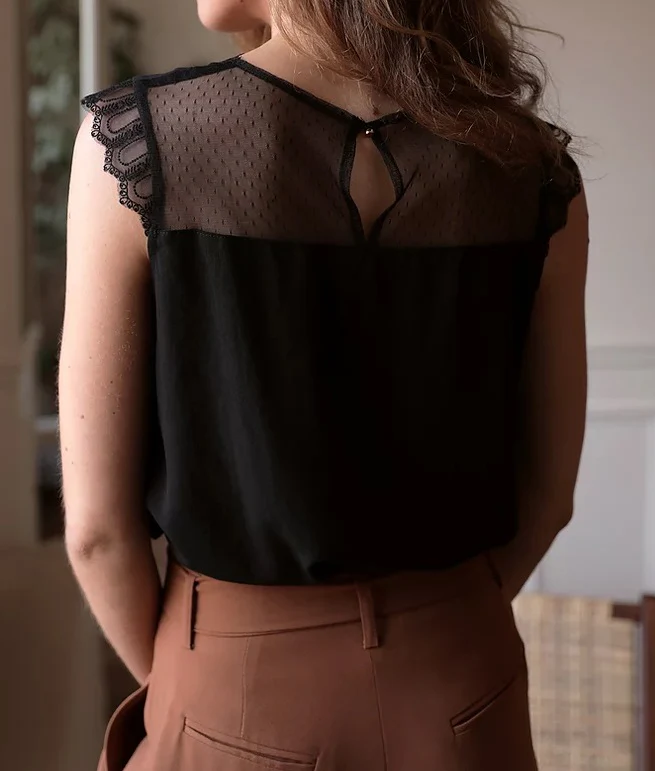 Blouse sans manches Blandine noire tout en élégance et raffinement grâce aux empiècements tulle le long du décolleté, sa coupe fluide et sa tulle au dos.
