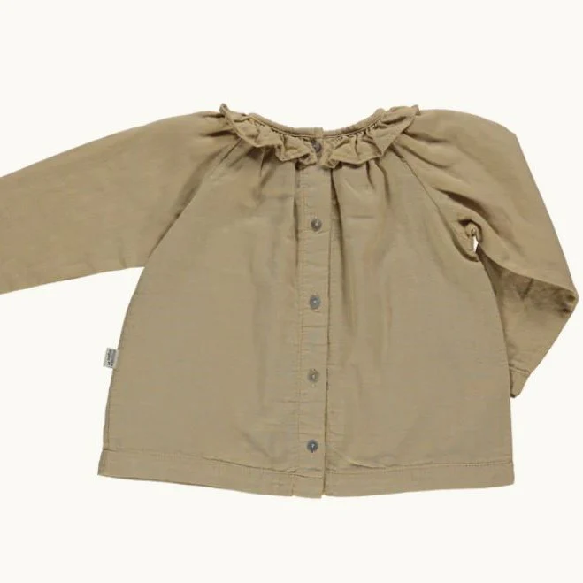Blouse beige avec col à volants. Iconique et intemporelle blouse charme avec son col volant, avec boutons à placer à l’avant ou au dos! deux manières. Mixte. 100% coton issu de l’agriculture biologique. Made in Portugal