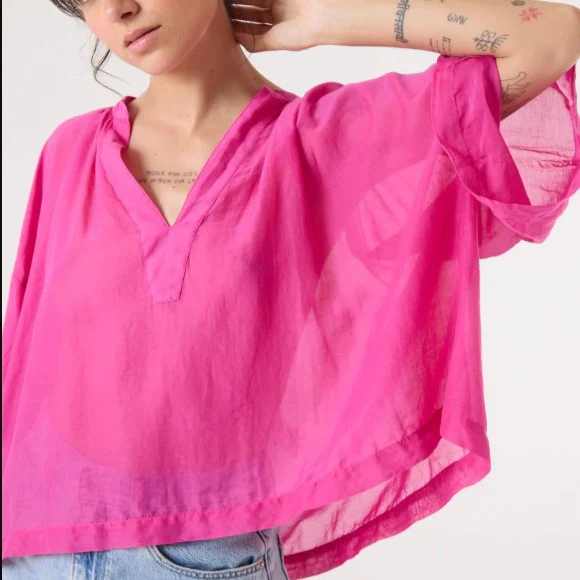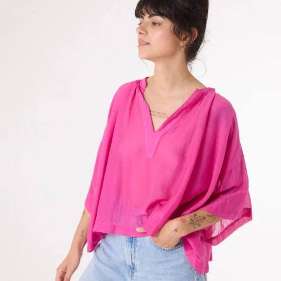 Ce top féminin à manches courtes est réalisé dans un voile de coton et soie bio, offrant une sensation de légèreté et de douceur. Sa coupe ample et sa subtile brillance créent une silhouette fluide et élégante. Le col mao fin et l’encolure tunisienne apportent une note de raffinement supplémentaire, faisant de ce modèle un incontournable pour un look à la fois chic et décontracté.