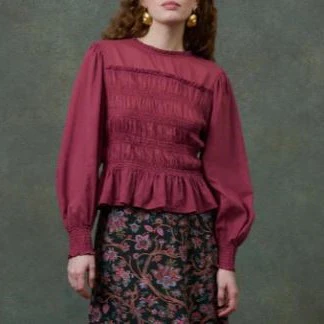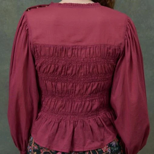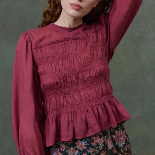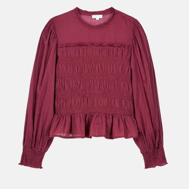 Blouse en voile coton col rond smokée sur le devant. Manches larges et poignets resserrés. 100% coton Taille normalement – Lavage 30 délicat