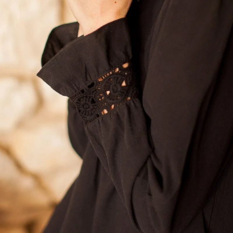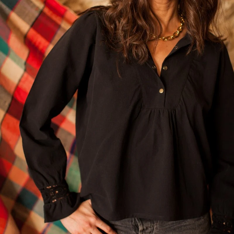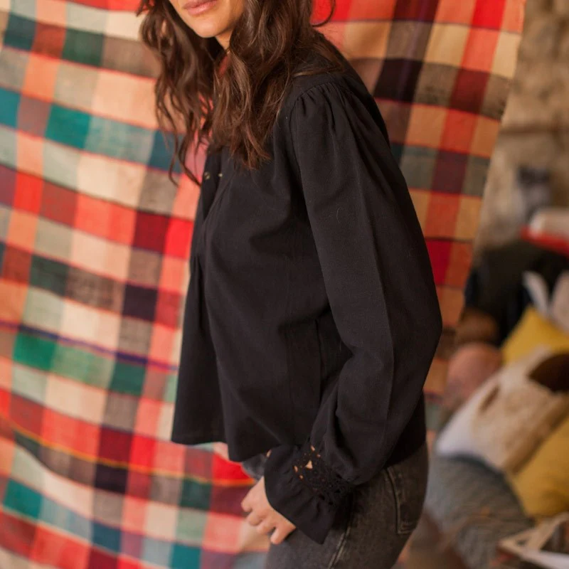Blouse bohème en coton texturée et aux détails délicats et originaux. On aime sa coupe féminine ample, les poignets ornés d’un galon brodé et sa découpe sur la poitrine . Une allure ethnique chic intemporelle et qui s’associe avec tout !