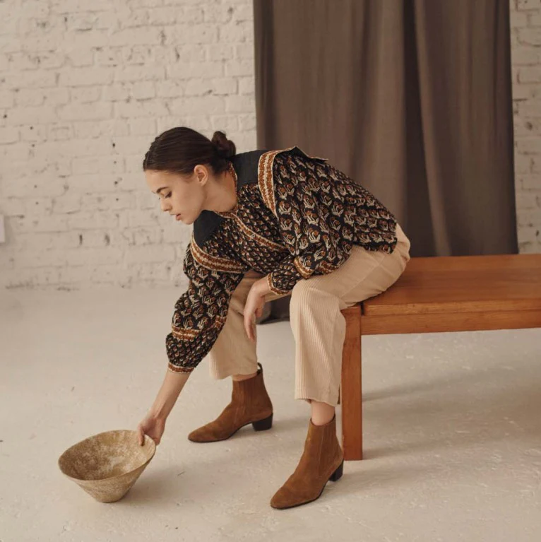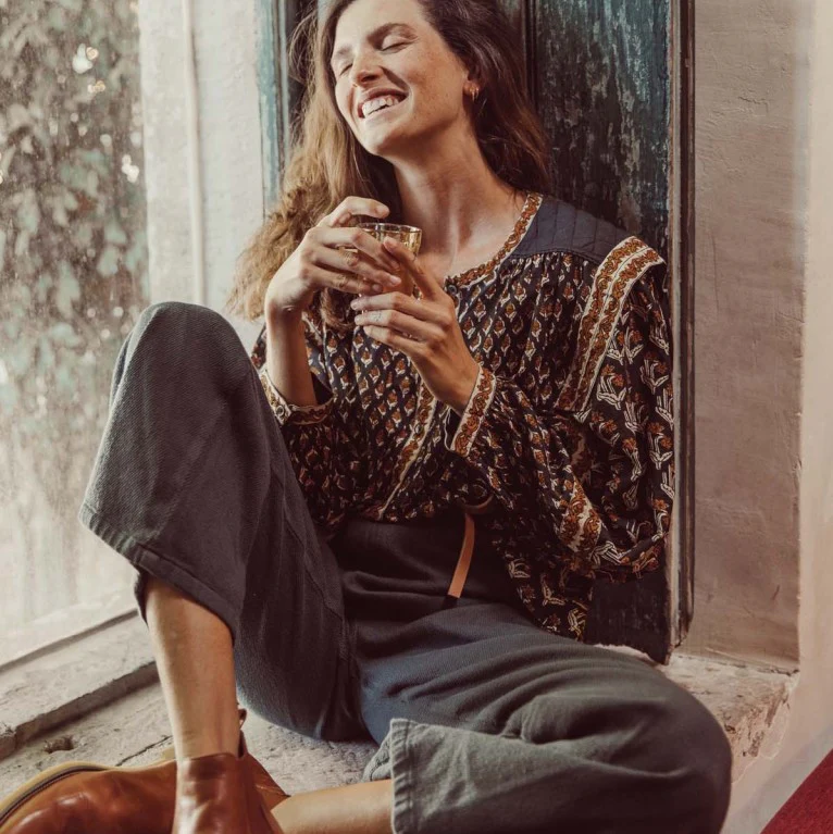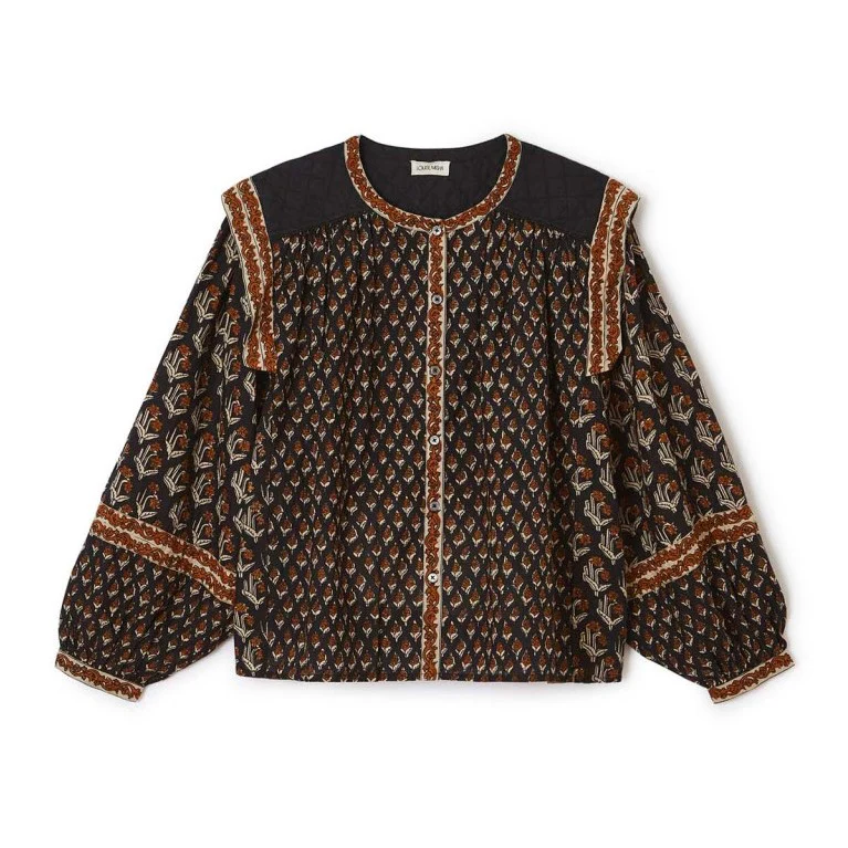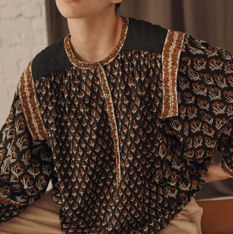 Blouse à imprimés folkloriques indiens à col rond. Elle est fluide avec des manches ballons pour accentuer le style résolument bohême. 100% coton. Lavage à 30° en machine – délicat.