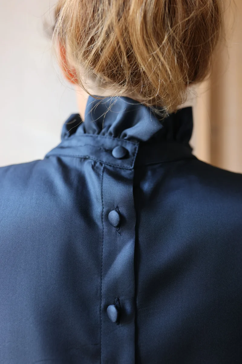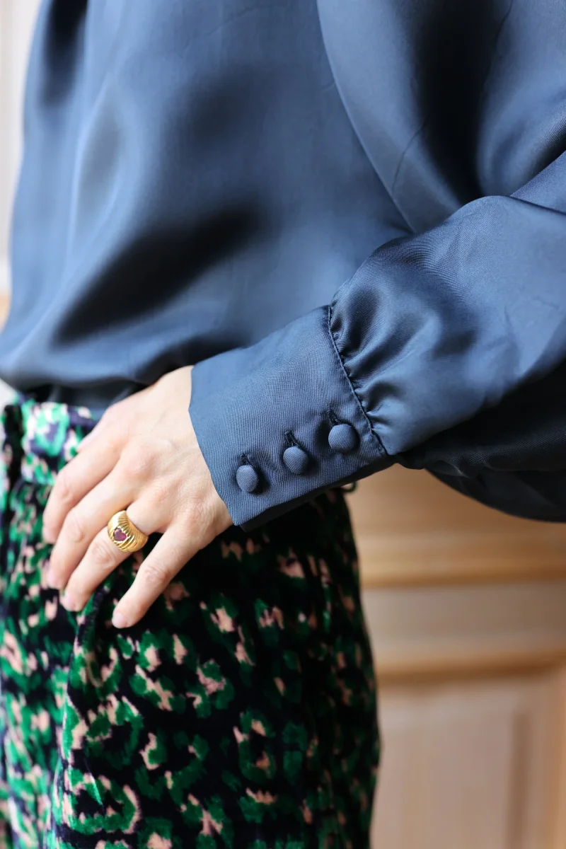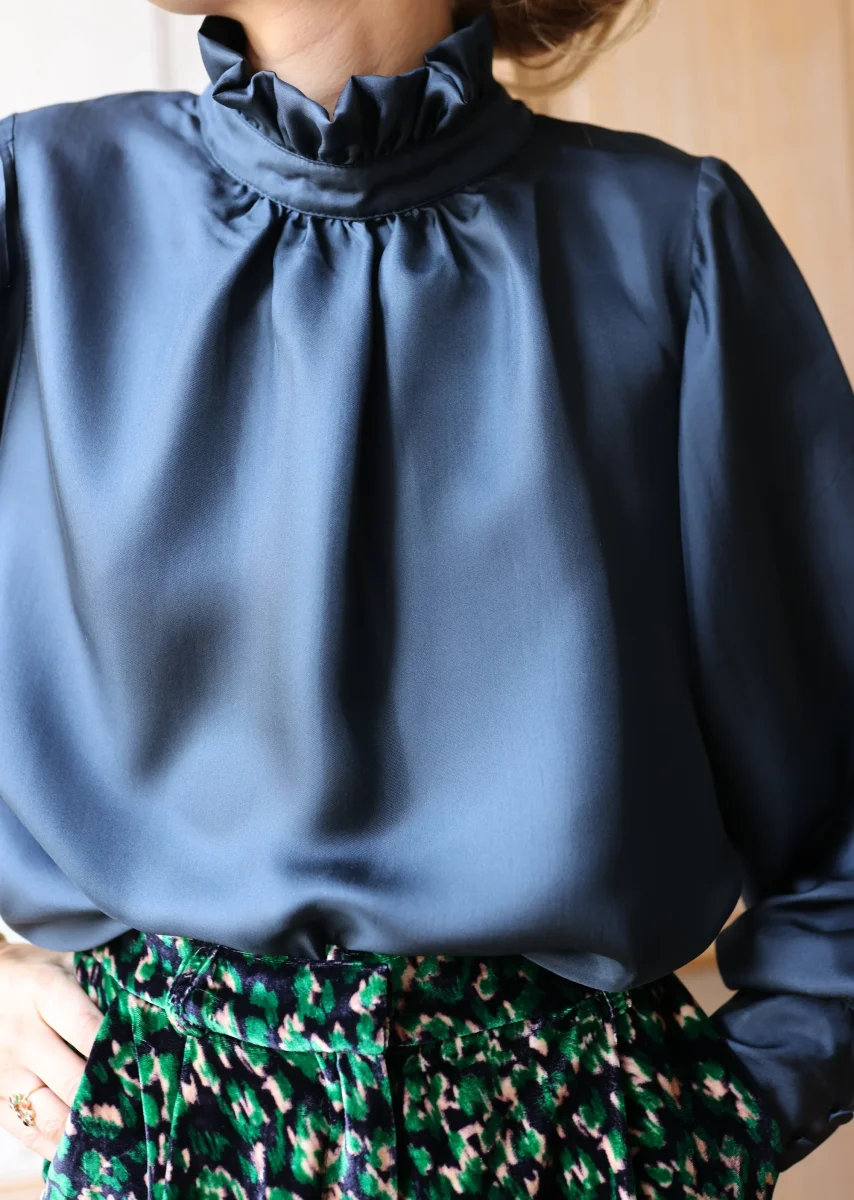 La blouse en soie Josette est très chic avec son col froncé et ses manches larges resserrées au poignet. La soie unie bleue est très élégante!