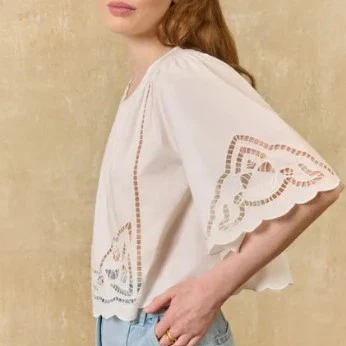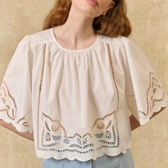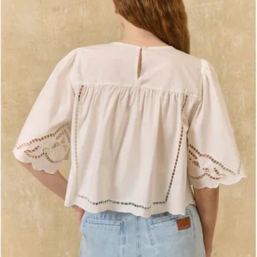 Blouse courte en coton avec découpes effet dentelles. Elle est coupée avec un effet volume type cape qui lui donne une fluidité et un tombé très agréable.