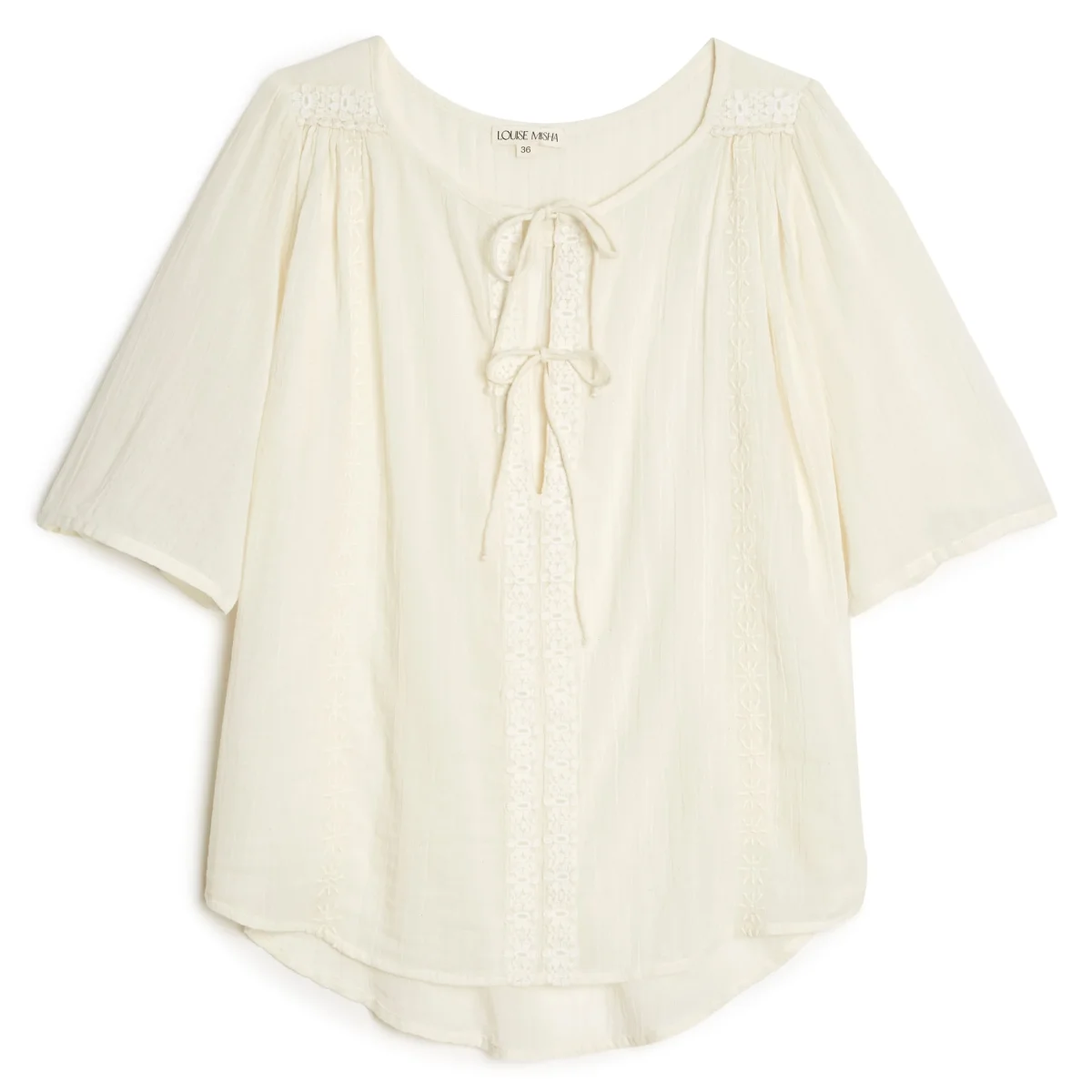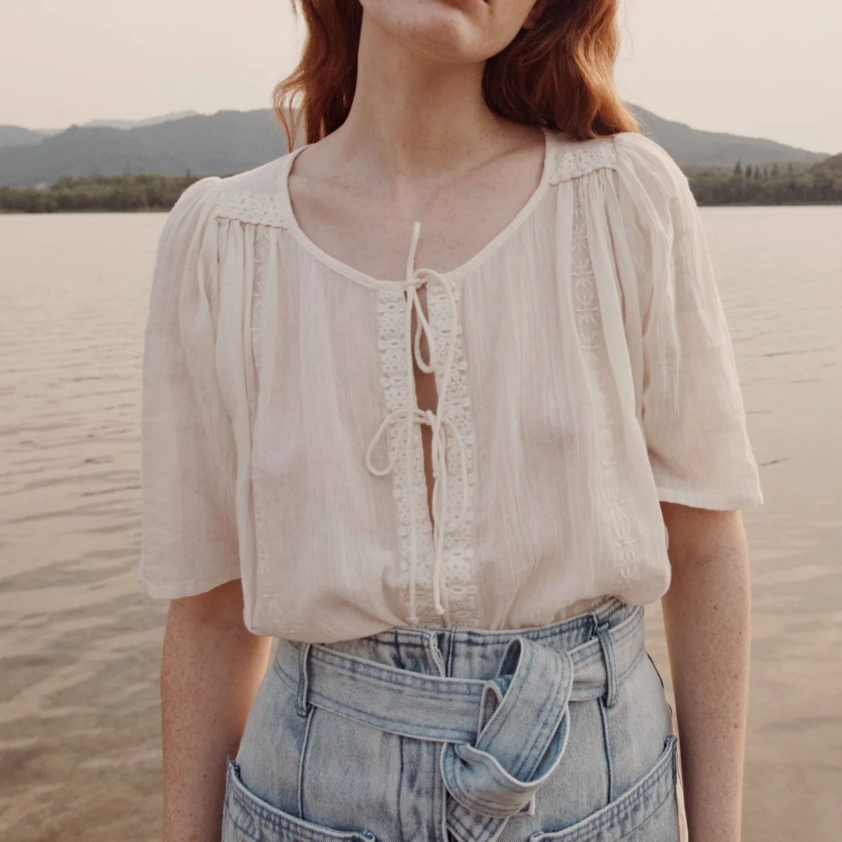 Blouse blanche col rond, c’est la pièce essentielle de la garde-robe. Confectionnée à partir d’un voile de coton d’une douceur sans pareil, c’est notre basique de l’été!Liens de fermeture. 100% coton biologique Lavage à 30° délicat / Ne pas javelliser / Ne pas sécher en machine / Repasser à la vapeur