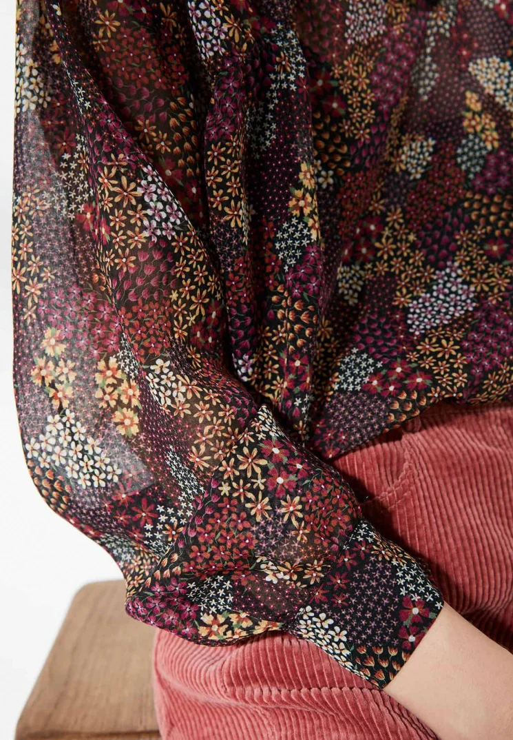 Blouse manches longues, légèrement transparente avec un caraco noir inclus. Encolure V, les poignets se ferment. L’imprimé est exclusif à la marque. Les mesures pour une taille 36 : Hauteur Totale : 62 cm Longueur épaule à épaule : 52 cm Tour de poitrine : 116 cm