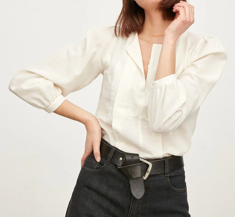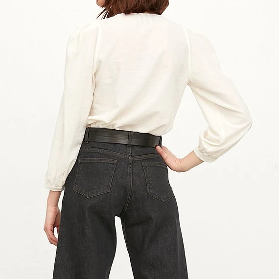 Blouse écrue à manches bouffantes au dessus des épaules. Sa coupe destructurée apporte du relief à son côté formel.