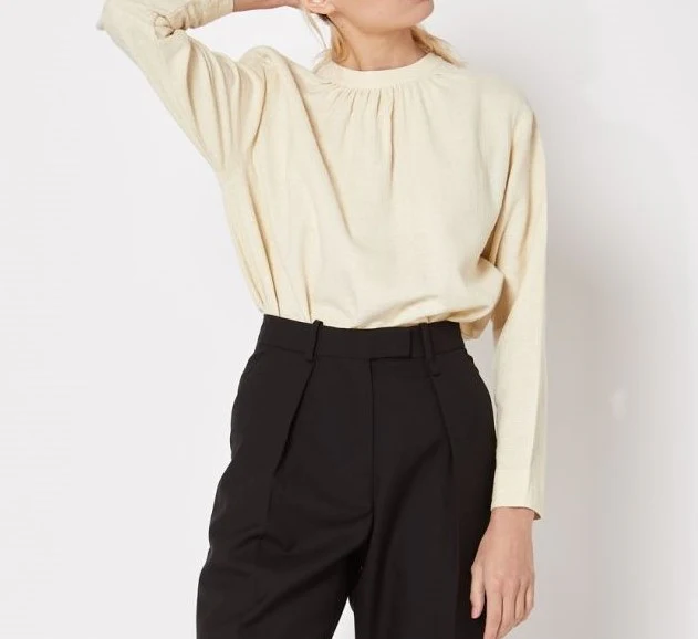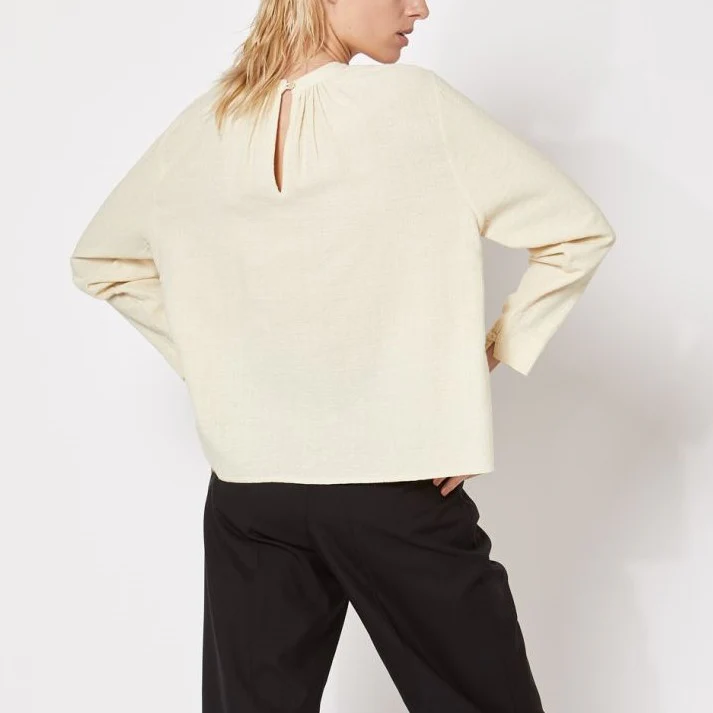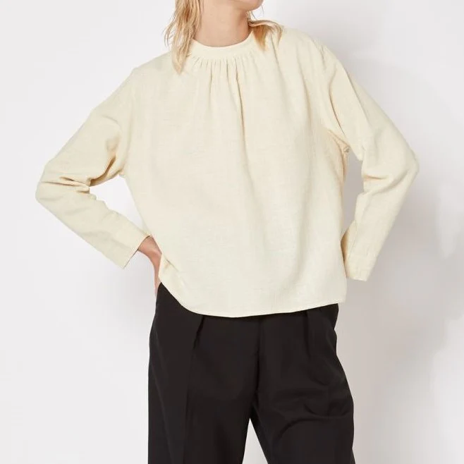 Blouse en soie de couleur écrue à col rond. Coupe ample adaptée à tous types de morphologie.
