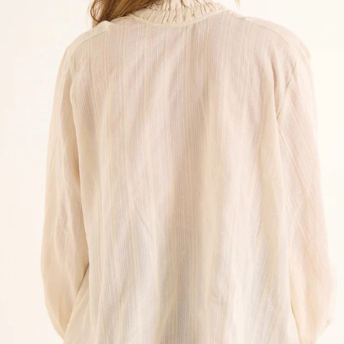 - Poignets boutonnés et bas de manches froncé pour un effet vaporeux et élégant.