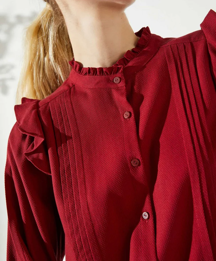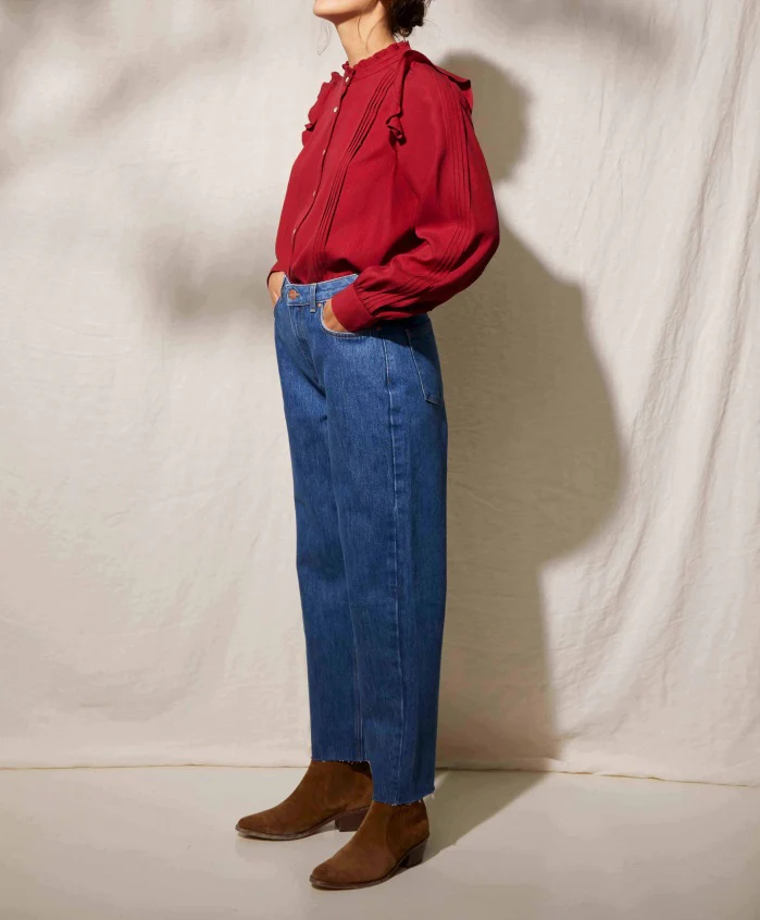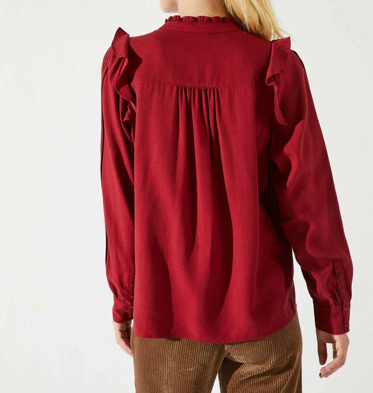 Blouse avec manches bouffantes et fronces au niveau des épaules qui lui donne un air bohême. Col rond.