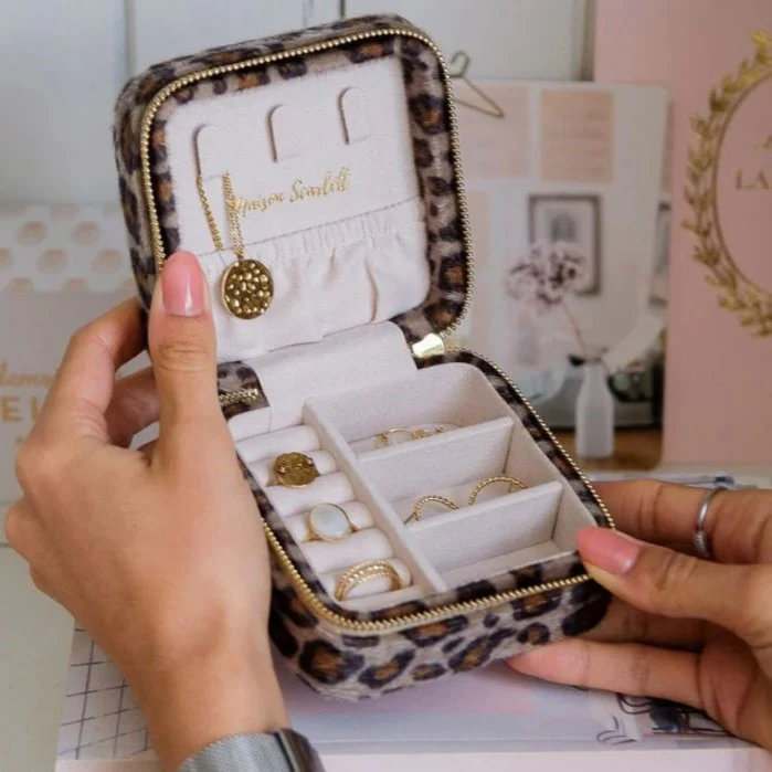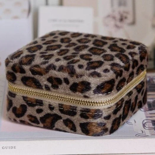 Emportez vos bijoux préférés grâce à la boîte à bijoux de voyage Corinne en léopard à la fois compacte et d’une grande capacité.