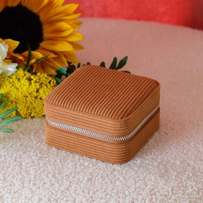 Notre boîte à bijoux de voyage Corinne en velours côtelé est aussi élégante que pratique. Malgré son format compact et sa forme carrée, elle offre un espace généreux pour ranger et emporter tous vos bijoux en toute sécurité : des bagues aux colliers, en passant par les boucles d’oreilles.