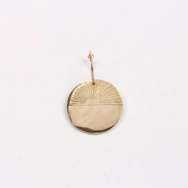 Créole en laiton doré de 15 mm de diamètre composée d’un disque gravé d’un soleil de 25 mm de diamètre.