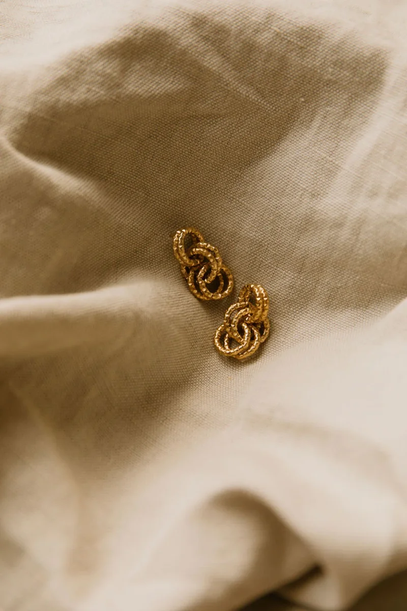 Boucles d’oreilles plaqué or 18k, façon clous (longueur 2,5 cm). Chaine avec maillons double martelés. Tige de boucles fait en argent massif 925 plaqué or. Bijou fait à la main en France.