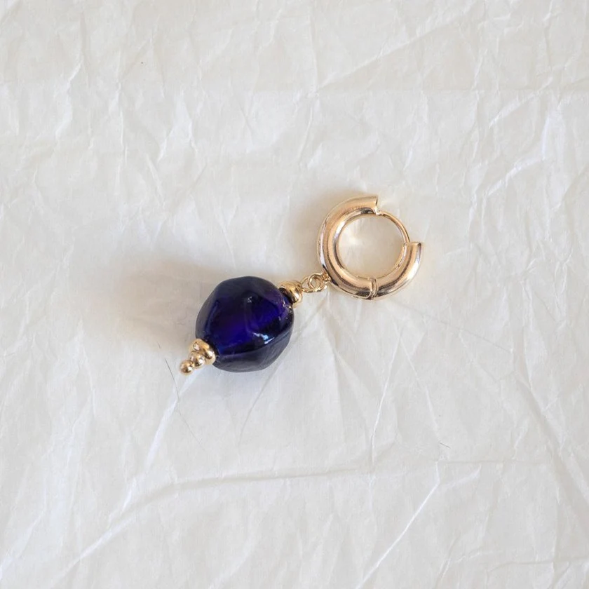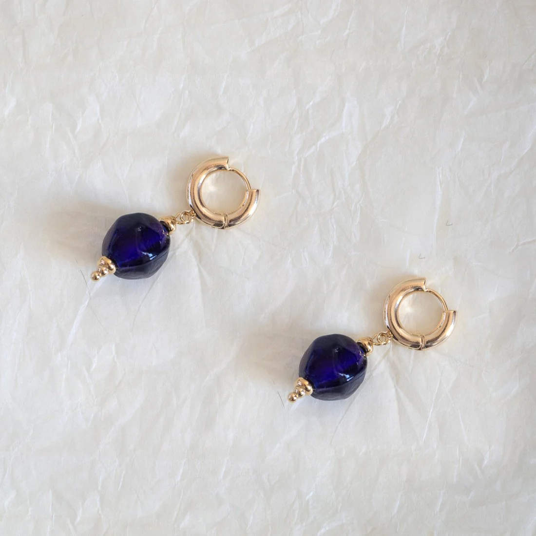 Les boucles d’oreilles créoles Bida sont dorées (or fin 24 carats). Les perles sont verre bleu mer Méditerranée.