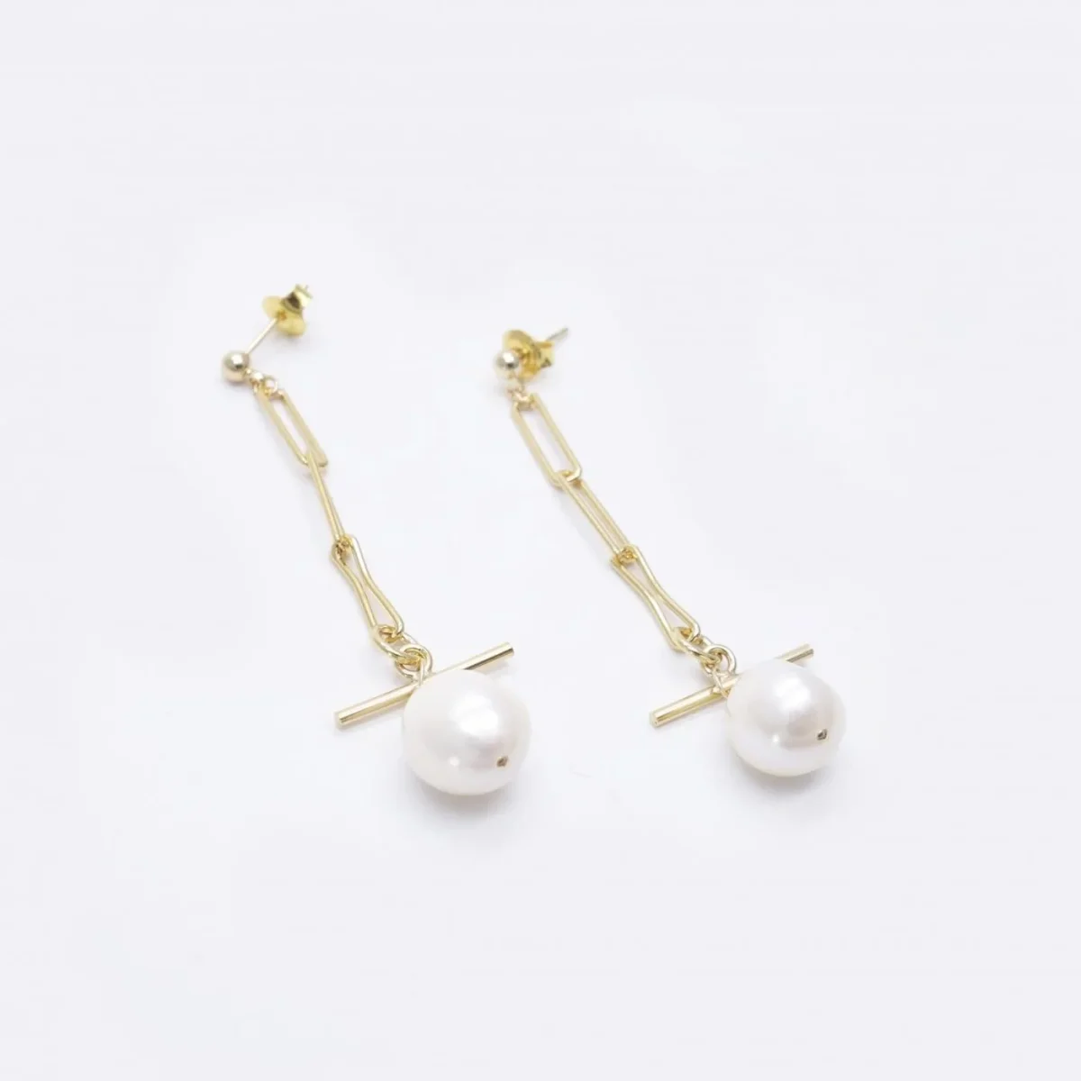Boucles d’oreilles façon clou de 5,6 cm de longueur, avec dorure 24k. Tige droite et perles de culture ronde (10mm de diamètre). Bijou fait à la main en France.