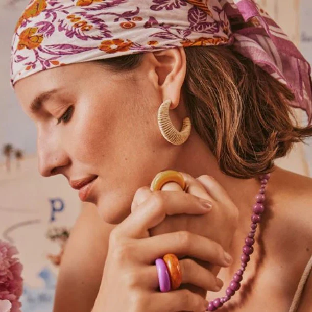 Créoles ouvertes en raphia de couleur, Détail effet bombé. Adaptées aux oreilles percées, fermoir attache poussoir.