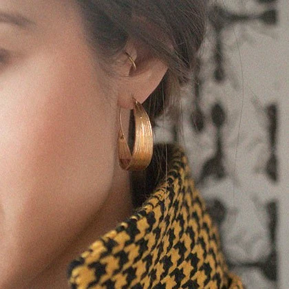Boucles d’oreilles type créoles. En laiton doré à l’or 24 carats de 0,5 micron d’épaisseur. Non oxydable et ne déteint pas. Diamètre d’une créole de 3 cm.Bijou fabriqué à la main à Paris.