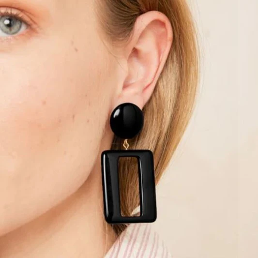 Boucles d’oreilles en acétate de couleur, détail forme rectangulaire, finition brillante.