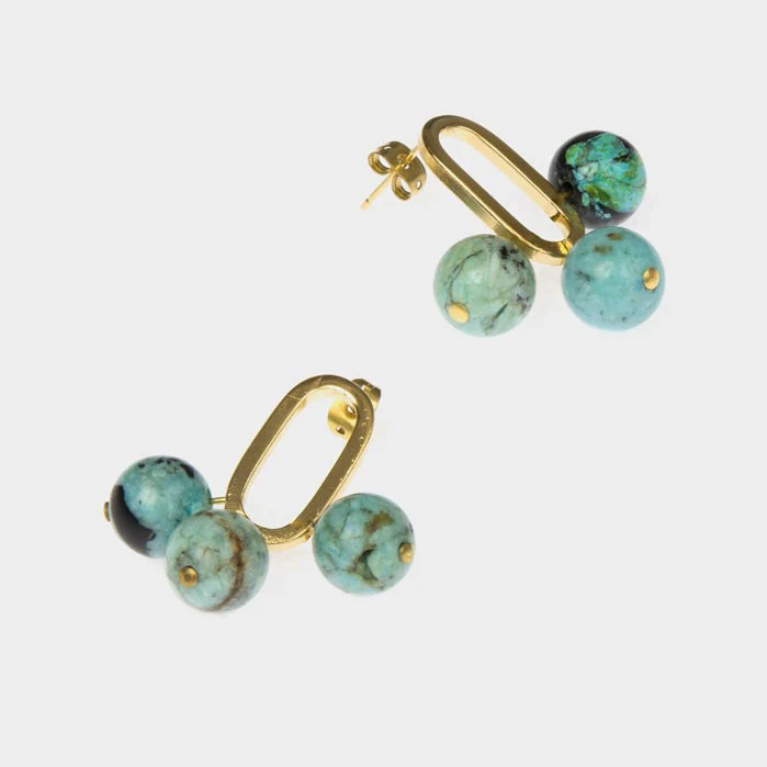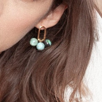 Boucles d’oreilles en laiton doré et ornées de perles d’opales bleues d’Afrique.