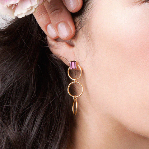 Boucles d’oreilles pendantes dorées à l’or 24 carats, ornées de cristaux swarovski violets.