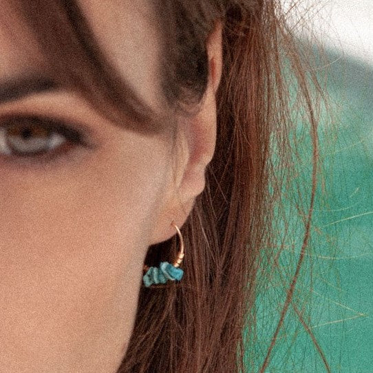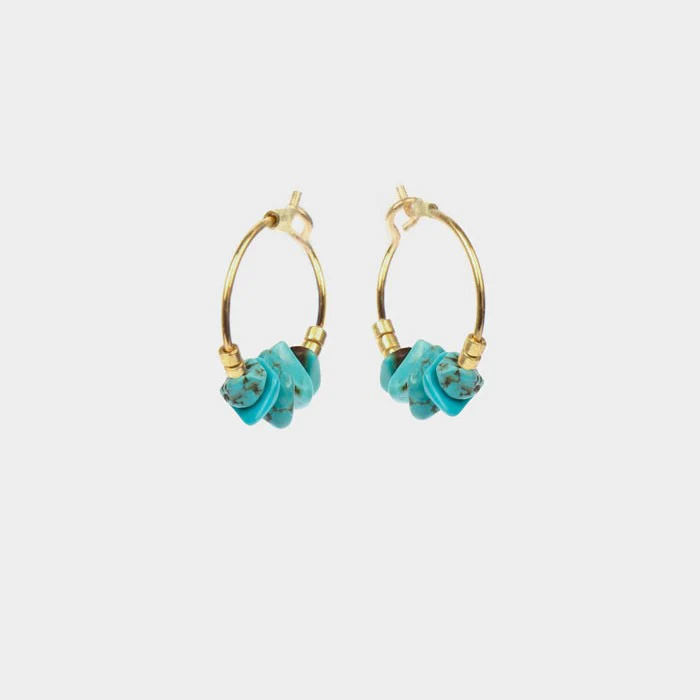 Boucles d’oreilles créoles dorées à l’or 24 carats et ornées de fines perles dorées et de pierres semi-précieuses de turquoises.