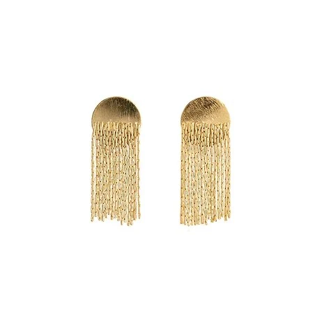 Boucles d’oreilles dorées à l’or fin 24 carats. Finition brossée. Longueur 3 cm. Largeur 1,2 cm. Les estampes font 1,2 cm de diamètre et sont serties de 15 chaînes en maille serpent. Bijou dessiné et fabriqué à la main par la créatrice Laure Mory dans son atelier parisien.