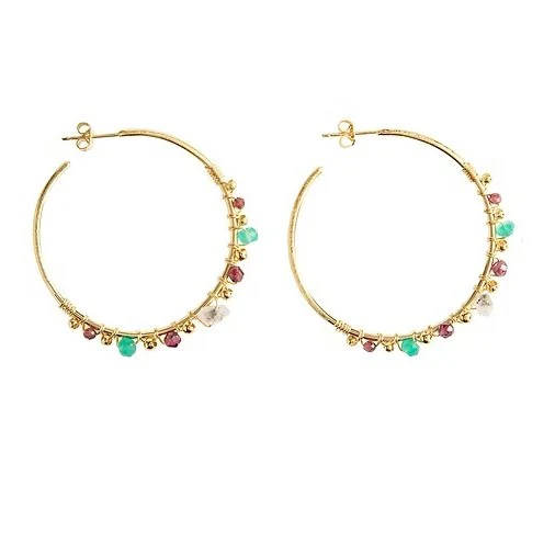 Boucles d’oreilles créoles, dorées à l’or fin 24 carats. Finition brillante. Diamètre 4 cm. Les perles de Grenat mesurent 0,4 cm et 0,2 cm, les Cristal de roche 0,5 cm et les Agate verte 0,4 cm. Bijou dessiné et fabriqué à la main par la créatrice Laure Mory dans son atelier parisien.