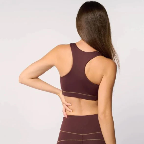 Brassière de yoga prune surpiqûres et broderie dorées, matière ultra douce, effet seconde peau. Double épaisseur pour éviter toute transparence. Dos nageur 100% confortable pour la pratique. Assure un excellent maintien de la poitrine sans bretelles qui tombent. Ne compresse pas les cervicales