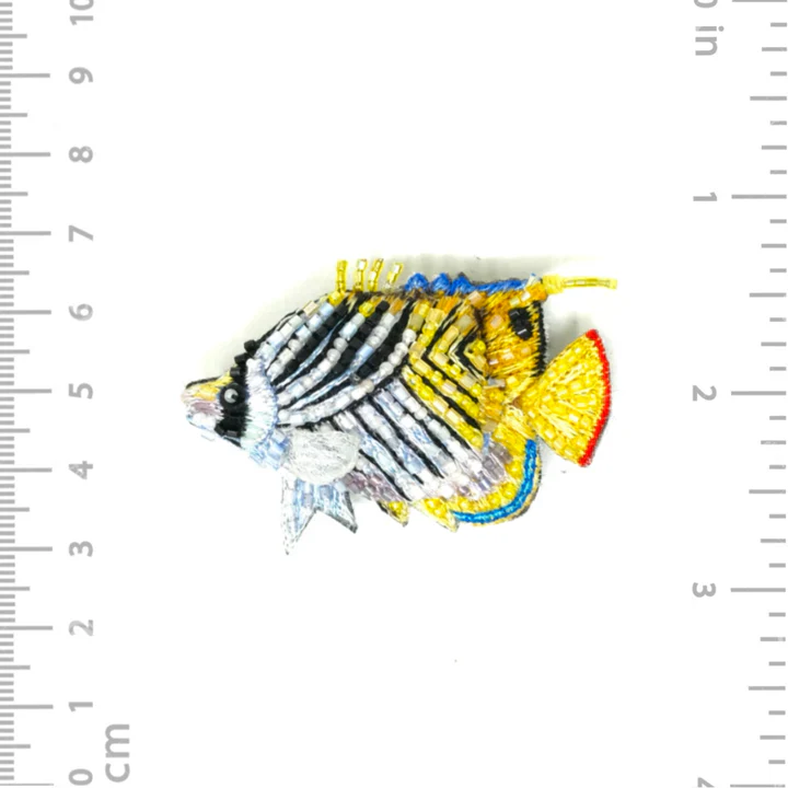 Véritables petits bijoux, les broches Trovelore sont brodées de plus d’une trentaine de matières différentes par des artisans. Minimaliste, la broche Poisson de Trovelore égayera vos tenues, sacs et manteaux grâce à son design unique !