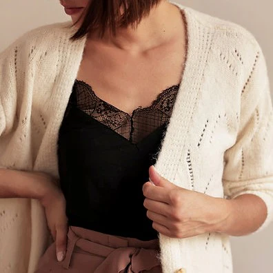 Caraco noir intemporel et indispensable à sa garde robe, sa dentelle apporte une touche d’élégance discrète.