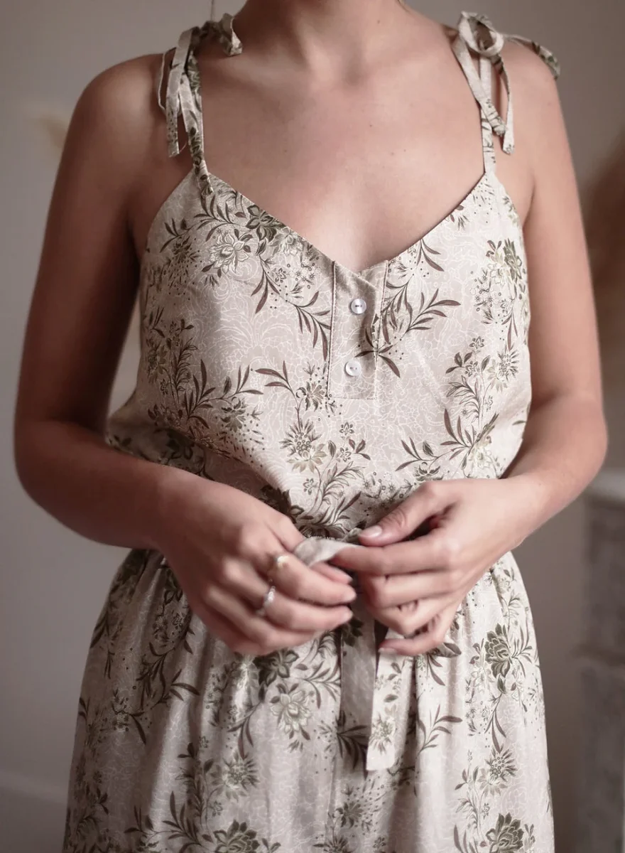 Caraco à fines dentelles, structuré et fluide avec des petits boutons recouvert devant. Il présente un joli décolleté dans le dos en forme V. 100% Viscose certifiée Oeko-Tex STANDARD 100 avec un touché délicat et ultra doux. Les imprimés sont développés à Paris et les tissus sont imprimés en France.