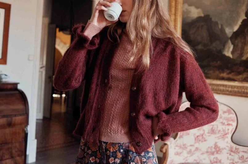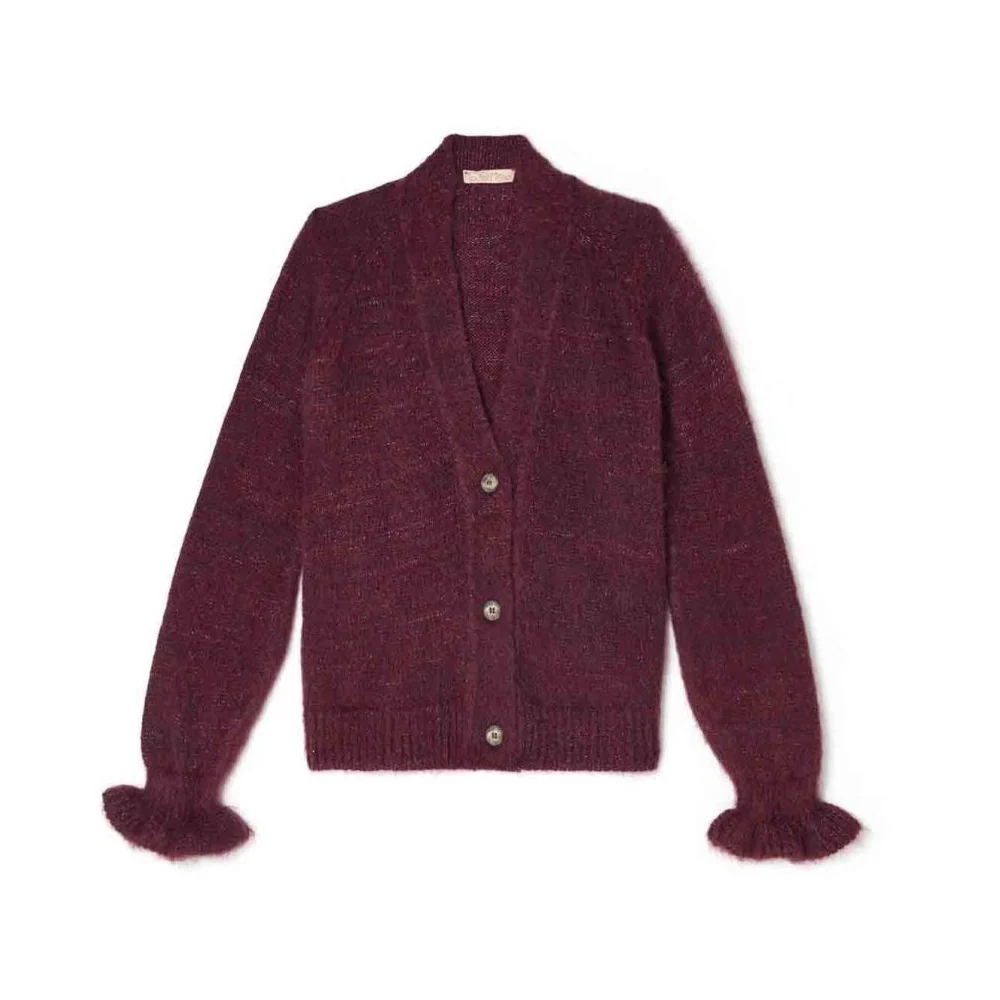 Cardigan couleur bordeaux composé de maille brossée. Ses poignets volantés, son camaïeu de couleurs et sa coupe droite ample lui apporte une originalité tout en restant sobre et élégant, associable à différentes tenues.