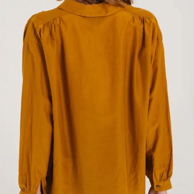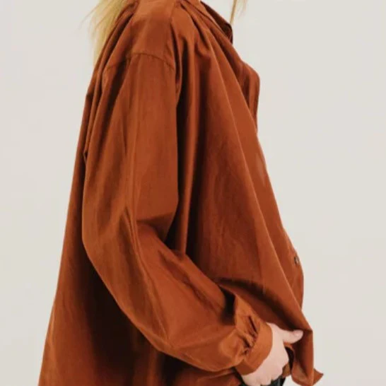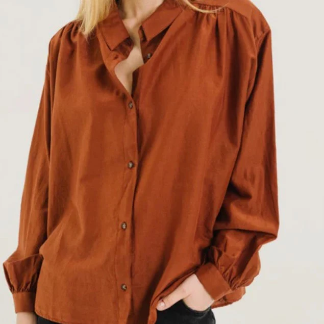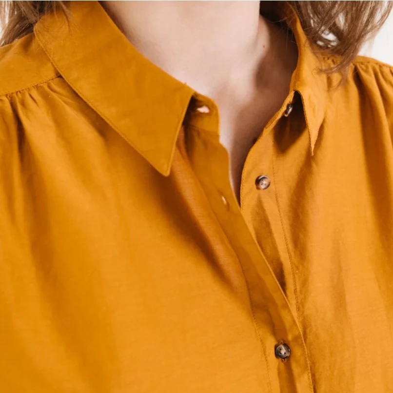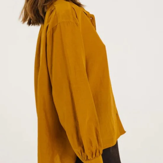 Blouse féminine à manches longues, réalisée dans un délicat mélange de coton et de soie. Elle se décline en deux teintes raffinées : un cognac chaleureux et un curcuma lumineux. Son tissu légèrement satiné apporte un éclat subtil, tandis que sa coupe ample assure confort et fluidité. Le col chemise classique confère une note intemporelle, et les fronces élégamment placées aux épaules et aux poignets soulignent son raffinement.