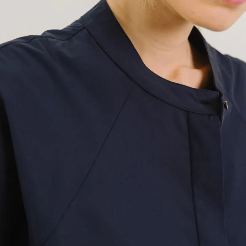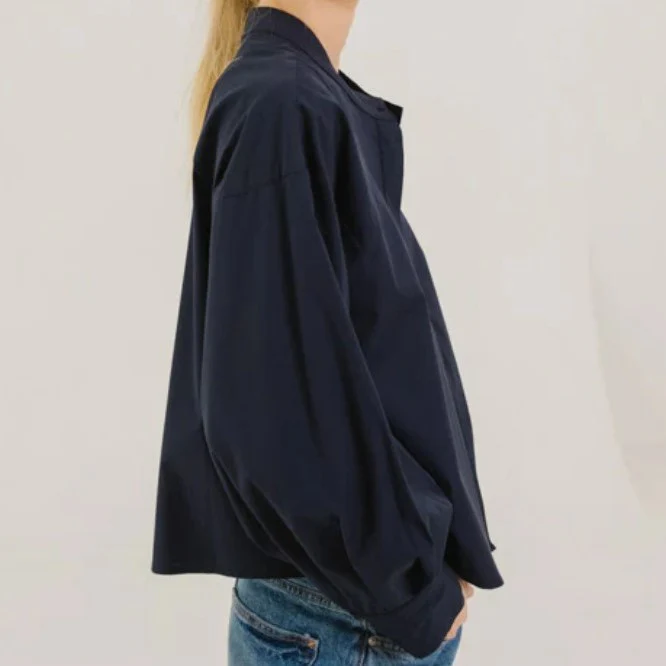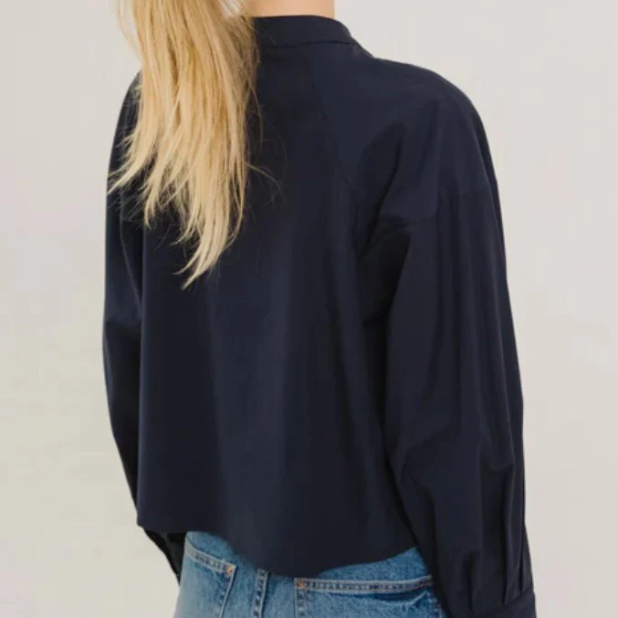 Blouse courte en viscose fluide. Ses manches raglan amples, subtilement structurées par un pli au poignet, apportent volume et légèreté à la silhouette.