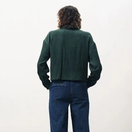 Apportez une touche de sophistication moderne à votre style avec cette chemise cropped en velours côtelé fluide. D’une douceur incomparable, ce tissu en velours vert est léger et agréable à porter, offrant un tombé fluide tout en conservant un aspect texturé. Ses boutons en nacre ajoutent une note de raffinement, parfait pour une allure élégante et audacieuse. La coupe courte met en valeur la taille et s’associe facilement avec des pantalons taille haute ou des jupes.
