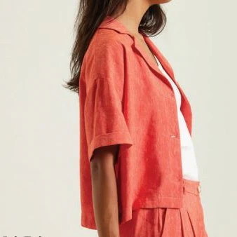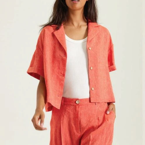 Chemise en lin corail, sa matière et sa structure en font une chemise parfaite à porter seule ou ouverte en surchemise.