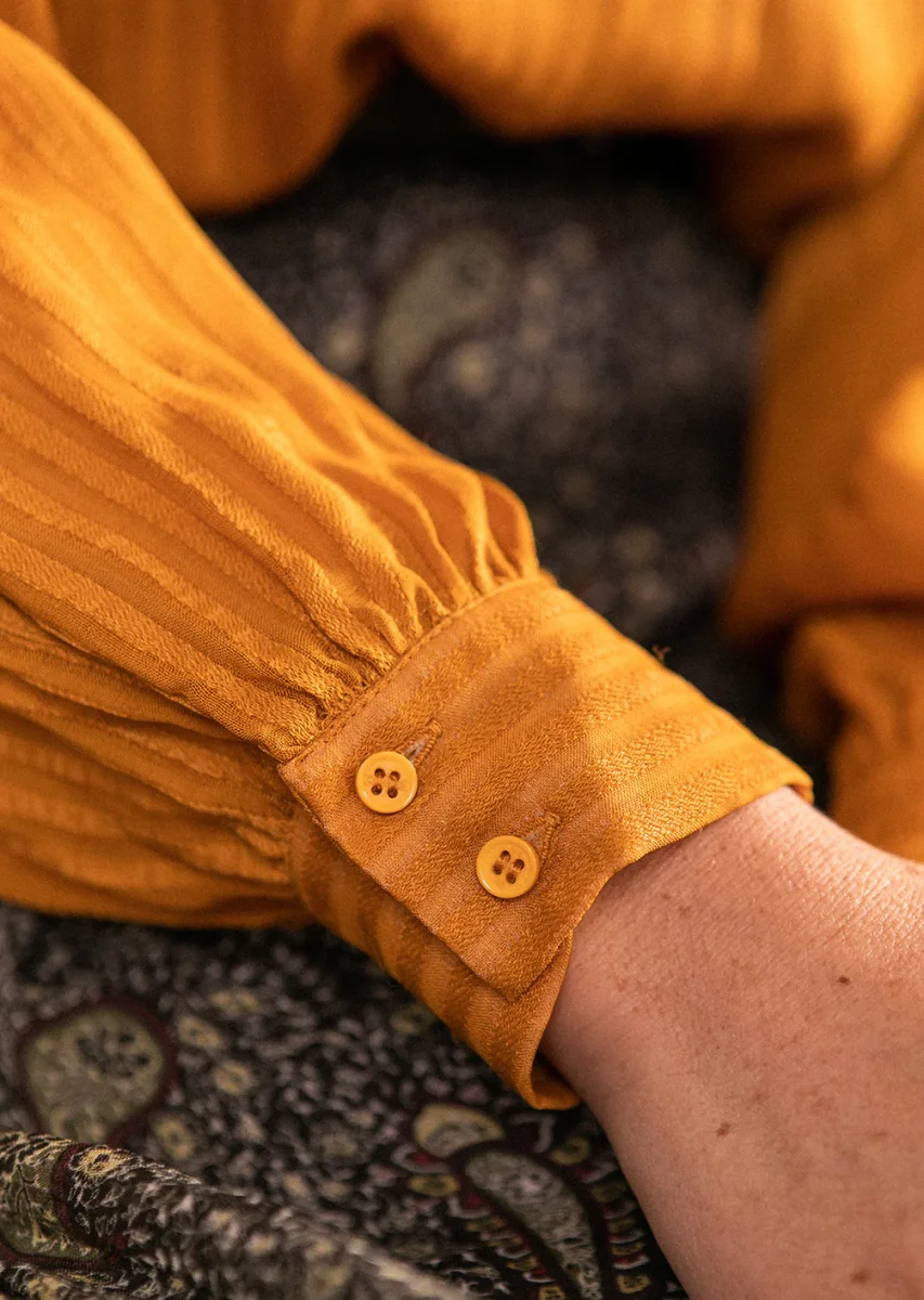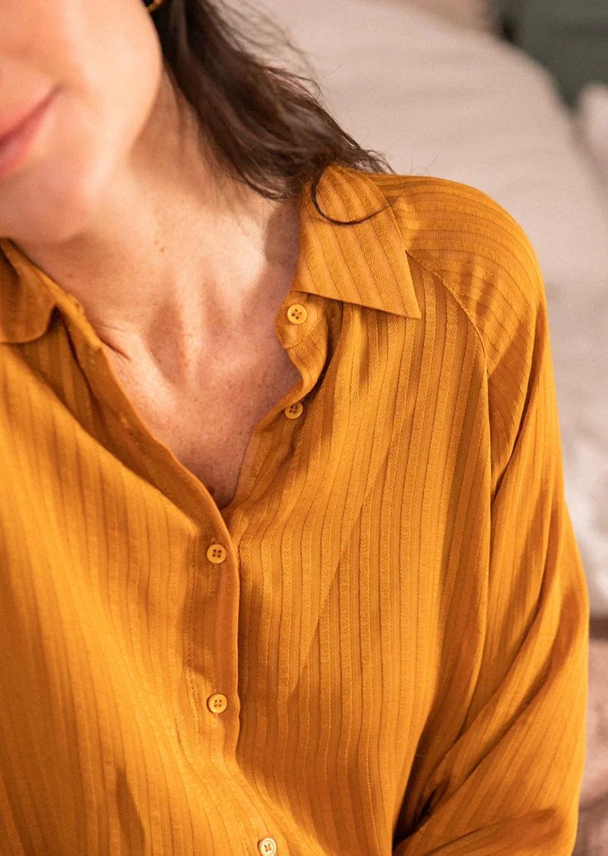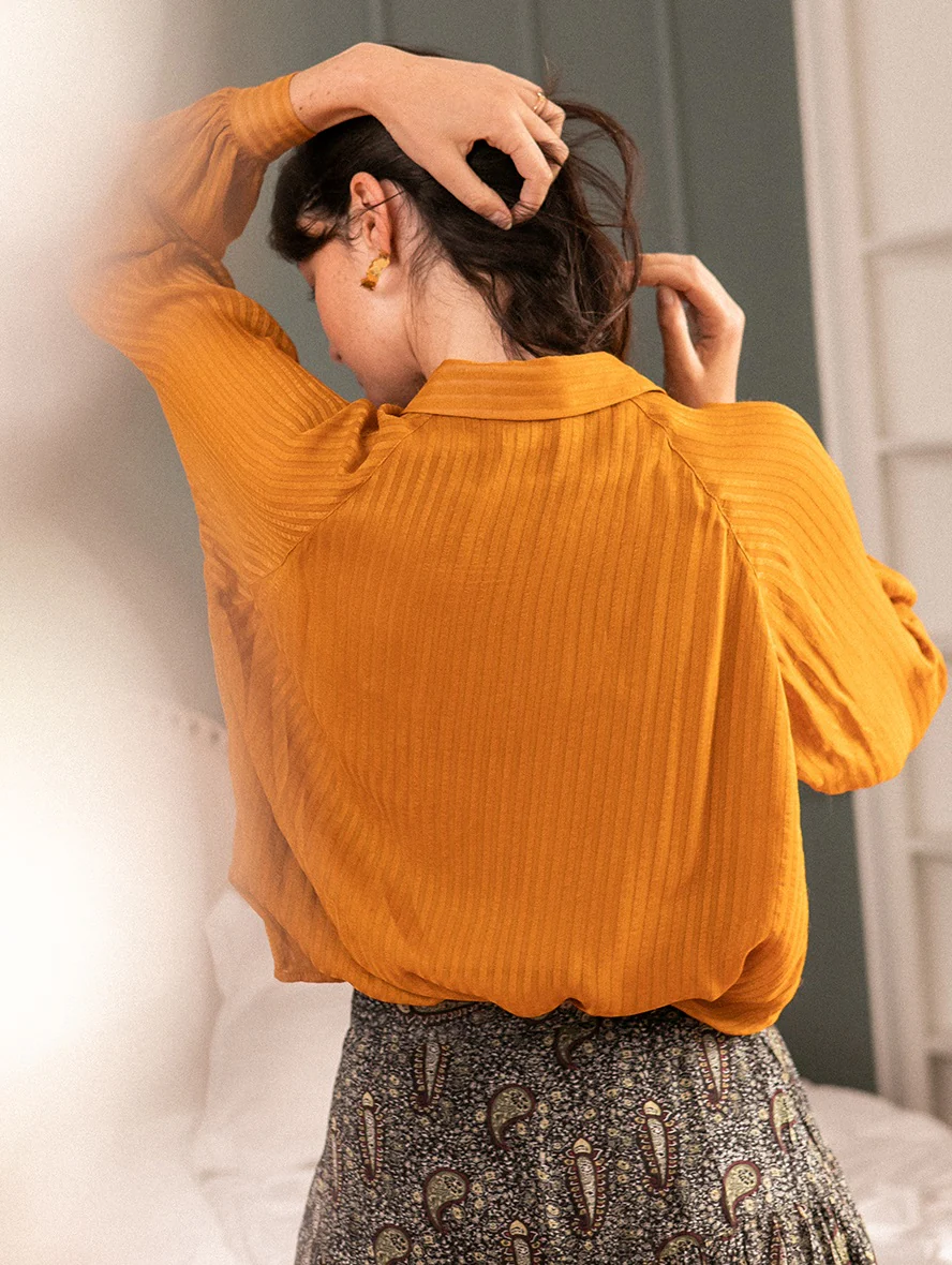 Chemise à col tailleur couleur ocre, en mousseline avec rayures verticales.