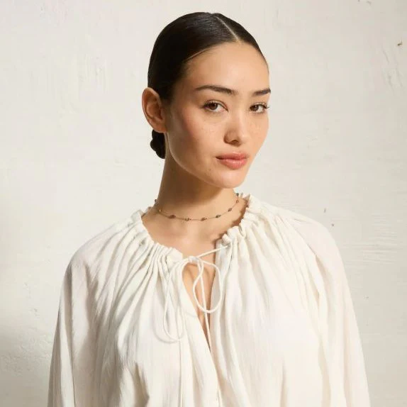 Aérienne et féminine, cette blouse à la coupe ample mise sur les volumes pour un effet tout en légèreté. Son décolleté ajustable, souligné de liens délicats à nouer, permet de moduler l’ouverture selon les envies ; sage ou plus audacieuse.