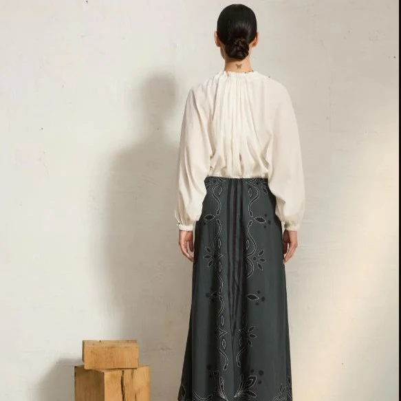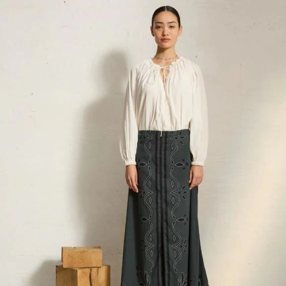 Les manches bouffantes, généreuses et vaporeuses, viennent équilibrer la silhouette et se resserrent délicatement aux poignets pour une touche de structure. Facile à porter, cette pièce polyvalente s’adapte aussi bien à un look bohème qu’à une tenue plus sophistiquée. Un essentiel du vestiaire, entre douceur et caractère.