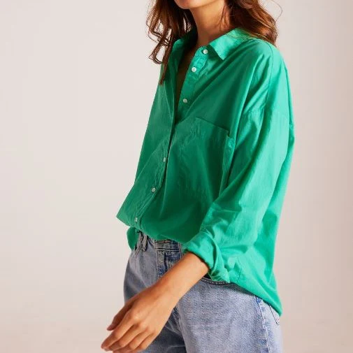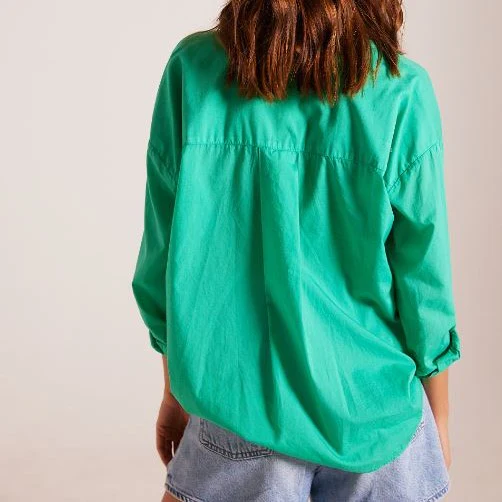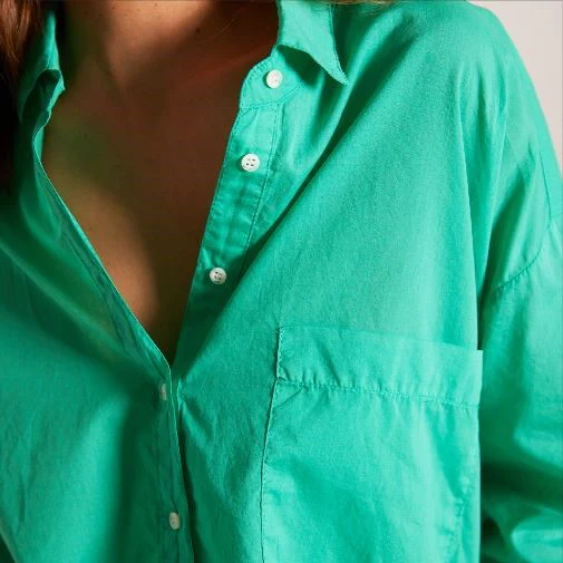 Chemise oversize en popeline unie. Boutons cachés, poignets boutonnés, patte capucin, détail pli creux dans le dos.Composition : 100% coton bci